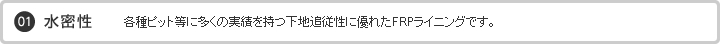 ピュアラ工法(PUR-1工法)とは水道施設向けFRPライニング工法です。耐水・耐食性及びクラック追従性に優れたビニルエステル樹脂とガラスマットを複合した工法で、FRPライニング工法の特色を最大限に活かした防水防食工法です。施工完成後の状態はシームレスで、膜厚が確保され、配水池の内面にFRP成形タンクを設置した状態に仕上がります。
